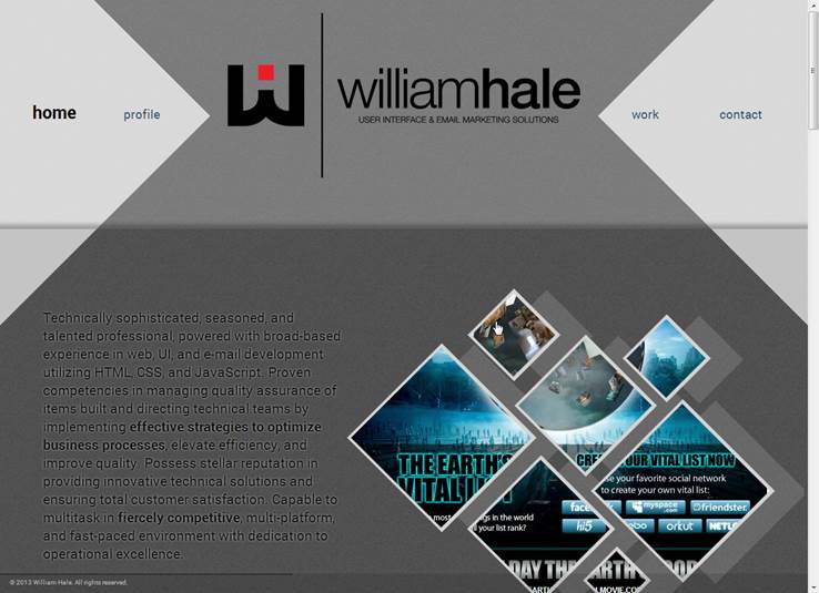 Commissioned by William Hale to display his work in a minimalistic manner, on one page with a little bit of texture. No request for CMS so the site was done with HTML5 syntax, CSS and jQuery. The gallery uses a horizontal parallax scroller that required a the code to be re-written into a jQuery widget to comply with a later jQuery library.